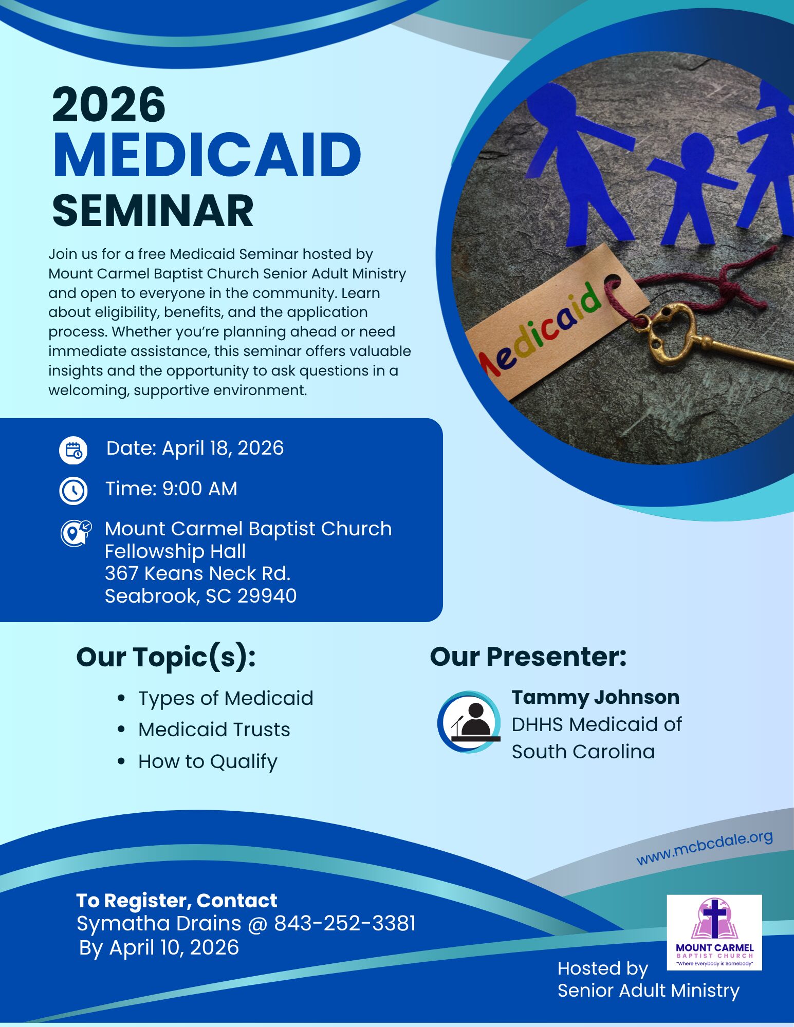 Medicaid Seminar We encourage you to join us on Saturday, April 18th at 9:00am for a Medicaid Seminar hosted by the Senior Adult Ministry. Come listen to guest presenter will... |